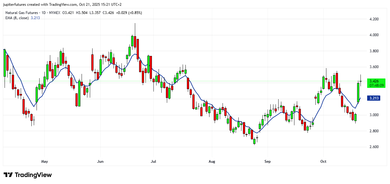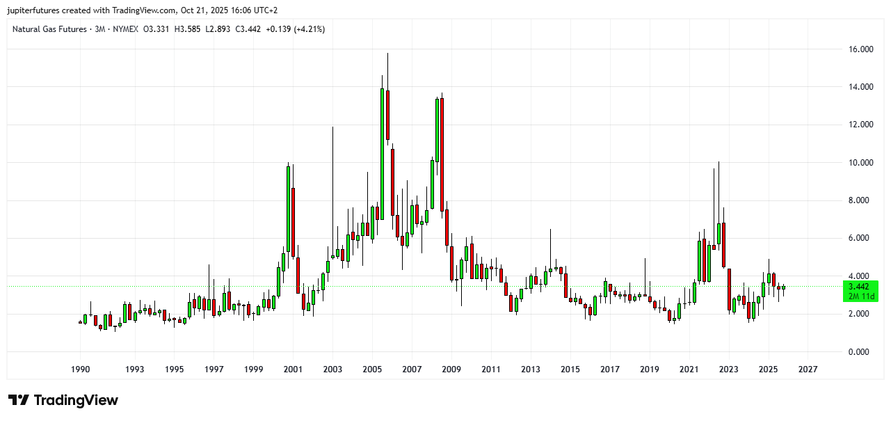 Please remember this very important point: In the last 35 years of Natural Gas (NG) futures charts — from April 1990 to October 2025 — NG has never been able hold on to higher levels above $5 for any longer duration than 3-4 months, because the Natural Gas production keeps rising rapidly often outpacing the demand, so the NG prices remain between $2-4 per MMBTU for most of the time, with $3 per MMBTU as the long term support level. That rate seems to give enough profit for the Natural Gas producers to remain profitable. So at higher rates like $7-8, the Natural Gas producers themselves become big sellers of NG futures, to lock in the higher rates, because they know that NG production will rise rapidly at higher rates, which will take NG rates down.